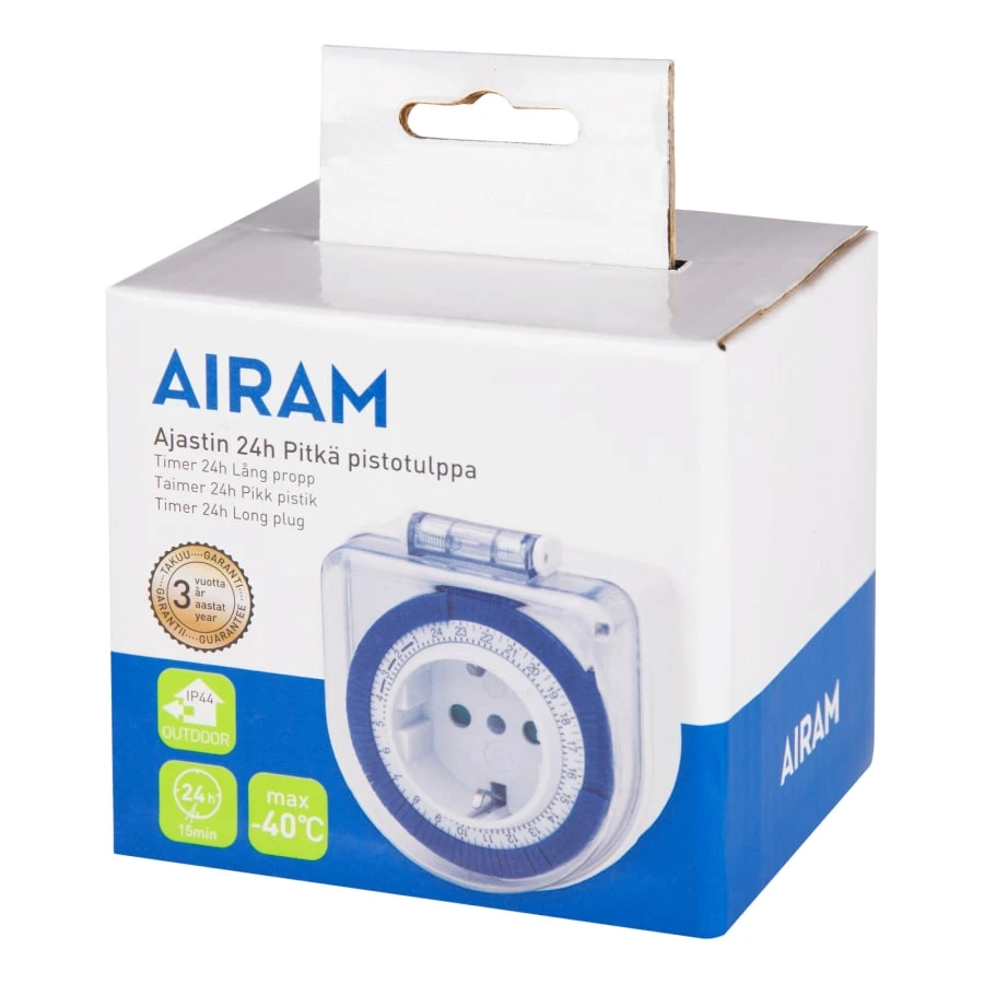 En timer lämplig för inomhus- och utomhusbruk med en lång kontakt. Den långa kontakten är bra för djupa uttag, som ofta finns i t ex bilvärmestolpar. Timerindelning 15 minuter. Timern har många funktioner, såsom automatisk timing av bilvärmaren eller gårdsdekorationsljus. Frostbeständighet -40 °C.