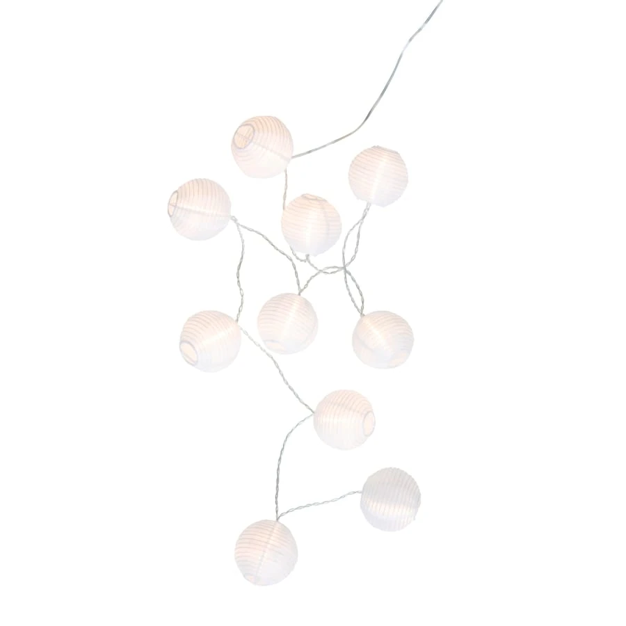 Ett set med 10 traditionella vita kullyktor. Diametern på en boll är 7,5 cm, avståndet mellan bollarna är 25 cm. Det varmvita ljuset reflekteras vackert genom bollen. Lyktserien fungerar med både en solcell och en transformator.
