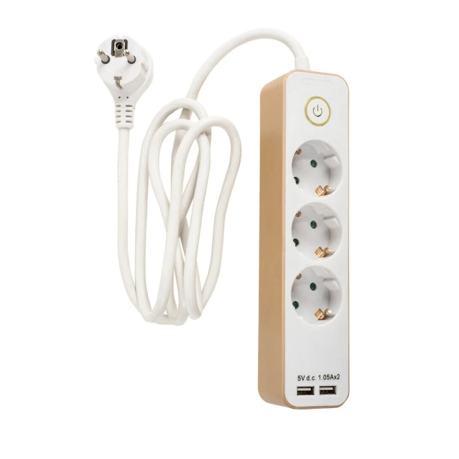 3-part extension cord with gold-colored cover and on/off switch, double USB 2.1A. Thanks to the flat plug, it is a good choice for placing behind the furniture, because then the furniture can be almost attached to the wall.