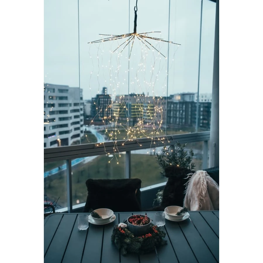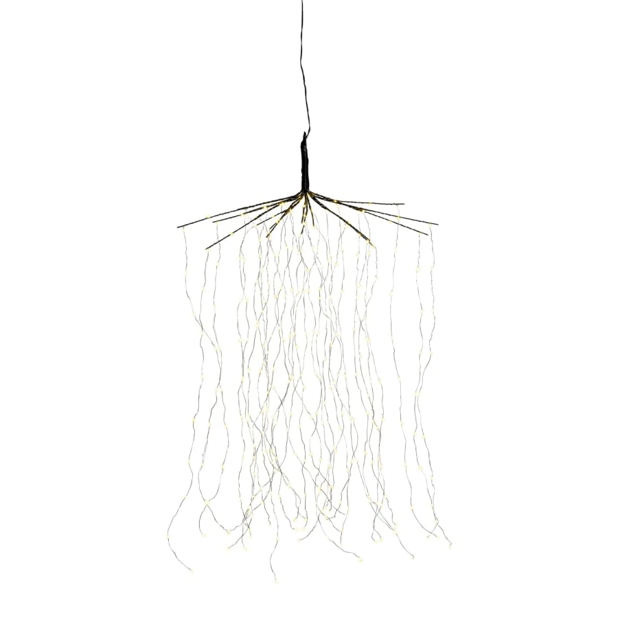 Bend the branches (15 pieces) open ”umbrella-like” and then unroll the light wires, which are two in each branch. The light wires can be left hanging or bent into the desired shape.