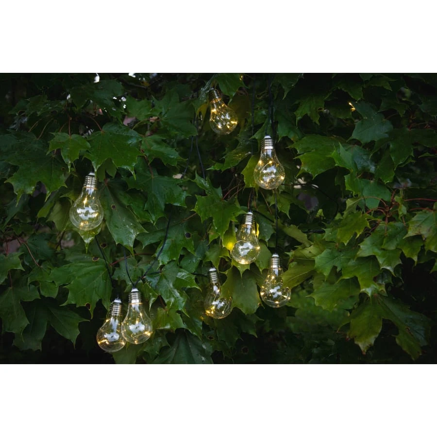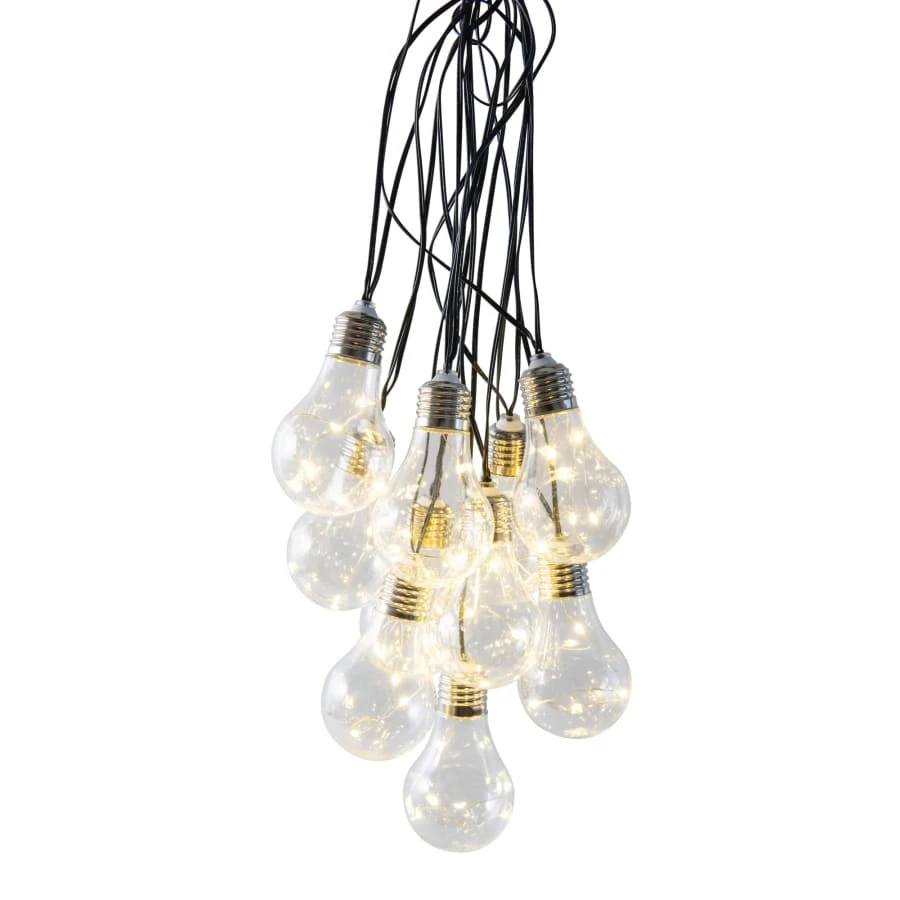 Solar-powered lamp set with ten bright, light bulb-shaped lamp domes. Inside each lamp, a light wire with five LEDs. Malta replaces the familiar Summer series and shines brighter than its predecessor. Replaceable battery Ni-Mh AA 1.2V 300 mAh.