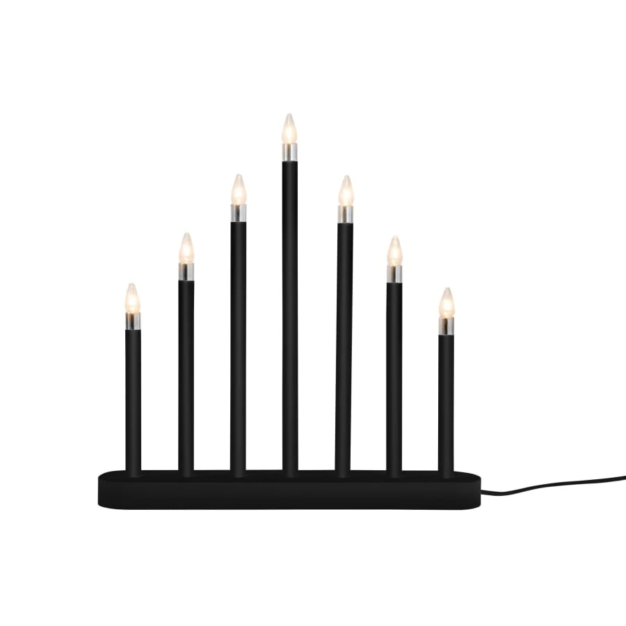 En ljusstake med utbytbara lampor som passar för skandinavisk inredning. En stor (H 45 cm x B 47 cm x D 8 cm) ljusstake i trä med metallbeslag. Produktens fasta struktur och vikt tyder på god kvalitet. Ljusstakens sju ljus lyser med ett underbart ljus. Kroppsfärg svart.