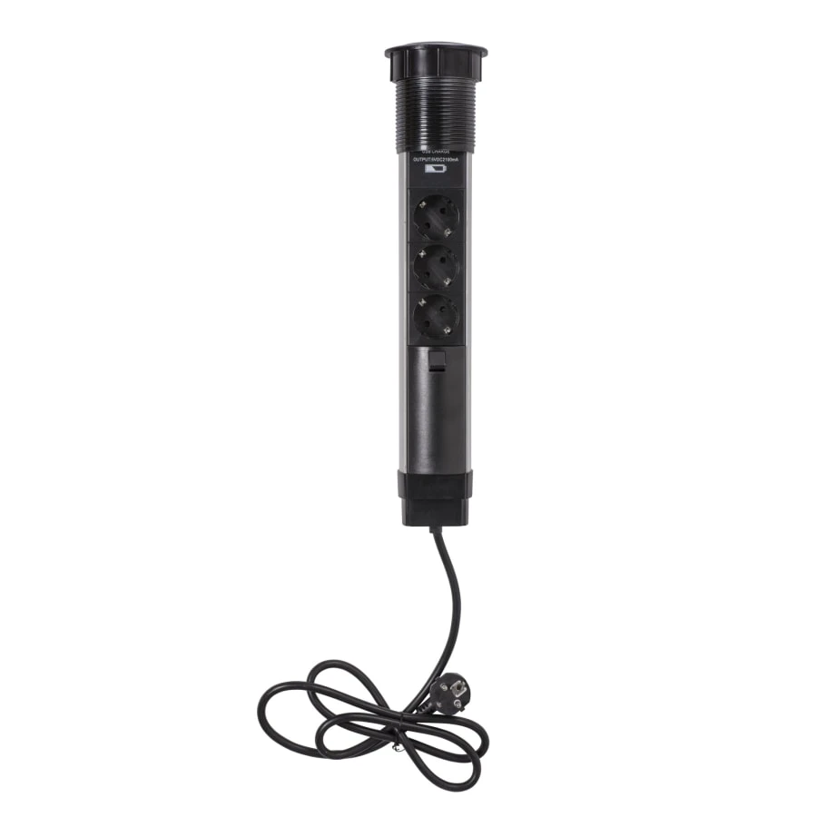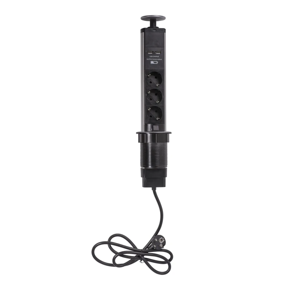 Infällt/utdragbart 3-delat jordat uttag med 2 x USB max 2.1A. 1,4m kabel. Diskbänksöppning Ø 70 mm.